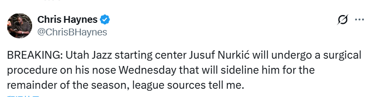 北京时间2月24日,据名记Haynes报道,犹他爵士队中锋努尔基奇将于明日接受鼻子手术,赛季报销。努尔基奇几年前鼻子骨折后,一直饱受呼吸和睡眠问题的困扰。